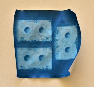 I tried sunprinting today, on the balcony. It was something of a disaster really, so here's to keeping the "creative" pursuits real here at the fog. First I tried some micro-casettes. These were a bad idea for starters as they are three-dimensional and so created their own shadow, because the sun is still going around the northern half of the sky and wasn't directly overhead. When I realised they were creating a shadow I rotated them mid-exposure. Bad move. I just blurred the outlines. Also, when they say 'leave to dry flat' they mean that. Don't move them mid-drying either. I think that is why I have this crumpled, curled-up mess of a piece of paper. And you probably don't need to swill the paper around so much in the water to "rinse" either but can just let it sit there.