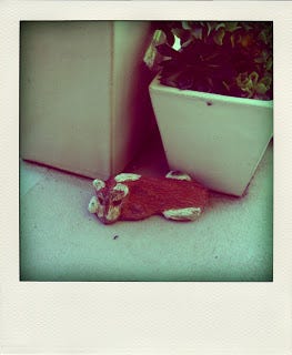I just went away for the weekend and stayed with my Aunt and Uncle and younger cousins. While I was there I was quite astonished, and a little moved, when I walked out on the back patio of their nice new house and spied this, curled up at the base of some pot plants: