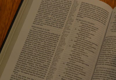 It fulfils all requirements I was looking for in that last post and looks good. The only thing I don’t like so much about it is the “easy to read type”, which is, to me, an ugly modern font that is rather stumpy, so that the difference between letters like an h and and n is very minimal (if you click the picture it will get bigger). Call me a fogey but I like my bibles with a more classic font, and I remain to be convinced this is easier to read.