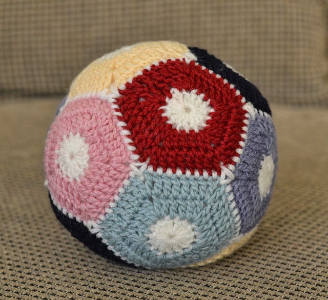 I haven't shown you all the ball I made for the expectant nephew, so here it is. I even put two little bells in it so he can annoy the rest of his family jingle about the house with it.