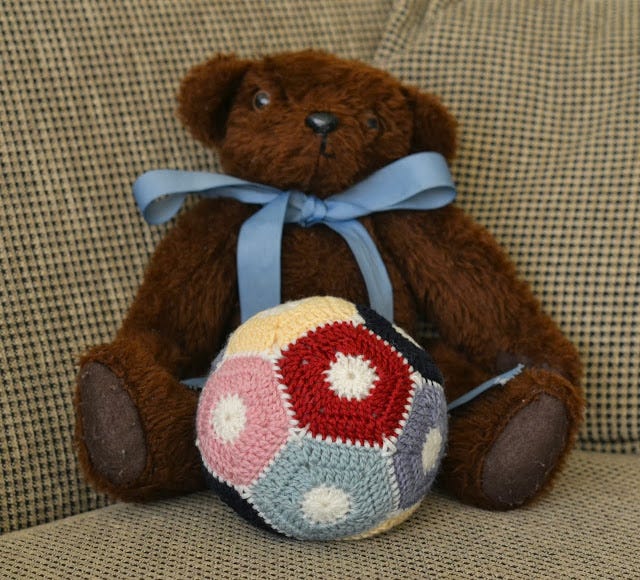 Here it is pictured with a teddy that my sister, who is having this baby (God willing), made once upon a time when she had a bear-making phase. (My sister had many and varied craft phases once, and every relative near and far received the Christmas presents to show for them.) I've told this story with the last crochet ball, but this bear got rejected because apparently his head was too small, so I rescued him. I'm like that.