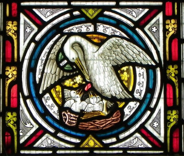 Apparently, it was once believed that Pelicans were particularly devoted to their young, and that a pelican would pierce her own breast to feed her young her own blood (see the bottom of this wiki). And from there it was (apparently!) a short leap to this bleeding pelican coming to symbolise the passion of Jesus and the Eucharist. This is perhaps owing to an association drawn in Psalm 102 vs 6 where Christ says he is “like a pelican of the wilderness” (though the identity of the birds mentioned there is uncertain, and it also reads as the Psalmist speaking). The website for the Pelican Foundation site of the Anglican church here describes it thus: "The symbolism of the pelican originates from Medieval Europe where the mother pelican’s devotion and attentiveness is to the extent of providing her own blood for her young when no other food is available. Within Christianity this imagery became a symbol of the passion of Jesus and of the Eucharist. The Pelican symbolises Jesus our Redeemer, the One who gives His life for our redemption."