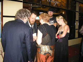 And here we are after wards at the party. I am the weird looking person on the left with the dead-straight hair. My friends did that to me, just for fun. I don't know that I like it that straight, but you have to try these things. I've also got the highest shoes on ever, because I borrowed them off my friends Mum. We are film premiere nincompoops and didn't think about the fact that we'd need to dress up (and were travelling hand luggage only), and also didn't know about the party afterwards till we got to Adelaide, so we made do.