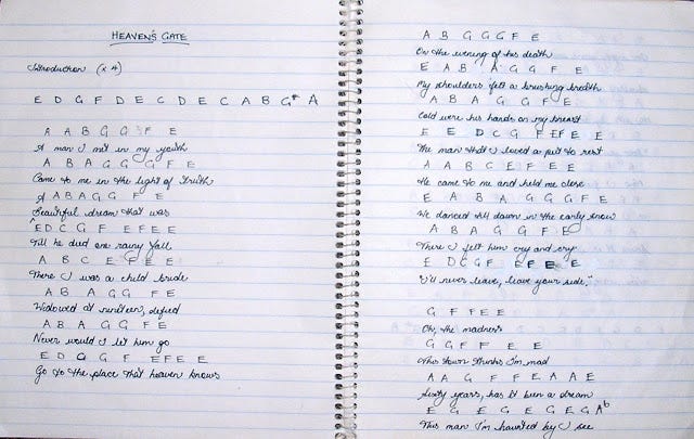 Ah, so much for this holiday, but this is very much a holidayish post. I was messing about in youtube and found my other old waltzing, flute-playing song. It’s called Heaven’s Gate by Toni Childs, and is all very tragically romantic (you need to read Wuthering Heights or some such thing and then listen to this). If you waltz through this whole song in a small space, you really will start crashing into the furniture, because it’s fast tempo and a person can get rather giddy. There is a nice section on the end for the flute (I think it's actually a keyboard, but it works on the flute), and a person so inclined can flit from the piano to waltzing the room to the flute. I still have my old music scribble book, and below is an example of the sophisticated way I used to scratch out music, in which I have used both G sharp and A flat(?). (And another thing you need to notice about this video is the crocheted hat!)