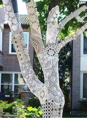 I've shared a few pictures of yarnbombing on this blog before, but this, this, takes it all to a whole new level. The word 'exquisite' is suffering from overuse, but this really is, don't you think? (It looks in places like it might be a composite of old doilies joined together, but the overall effect is quite lovely.) This finer kind of crochet hasn't made so much of a comeback as yet (though you do see doilies added to other things or turned into bunting etc), but perhaps it shall ... My Mum recently rescued some of my great-grandmother's crochet for me (my Nanna was going to throw it away!) after this fashion so I look forward to receiving it.